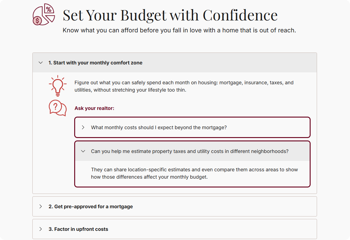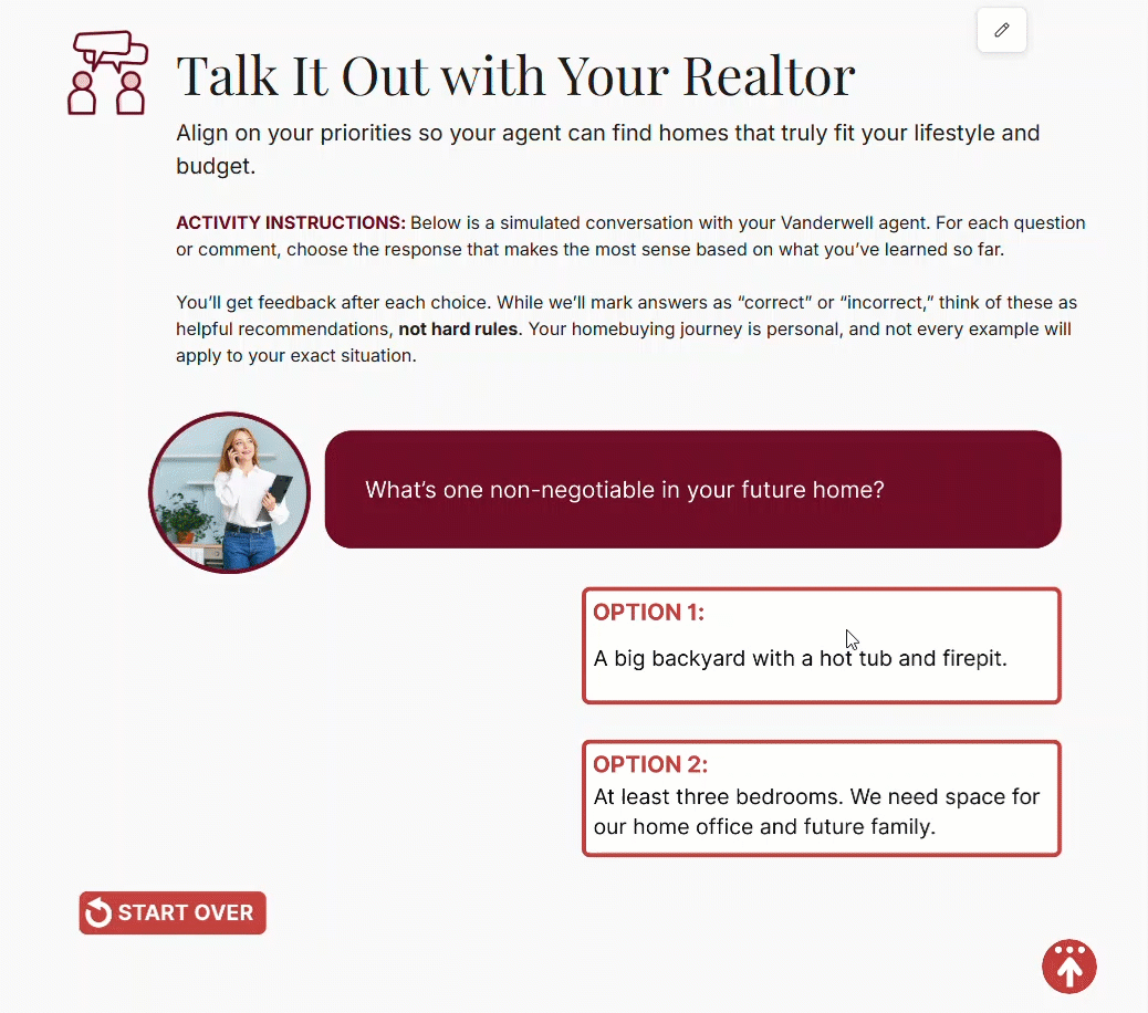 The First-Time Homebuyer Guide is an interactive eLearning experience designed to help new buyers navigate the excitement and stress of purchasing their first home. Through guided reflection and practical exercises, learners identify and prioritize their essential needs, like budget, size, and location, versus their wants, such as design features or luxury amenities.
